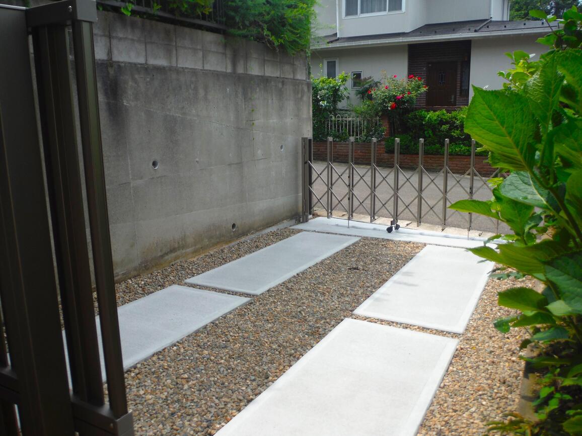 雑草の手入れが少ない駐車場が欲しいけど、全面コンクリートはコストがかかる…。そんな時には、コンクリートと砂利敷きの組み合わせをご提案しています。もちろん全面コンクリートの駐車場とは違い、多少の雑草は生えますが、お手入れはしやすくなります。