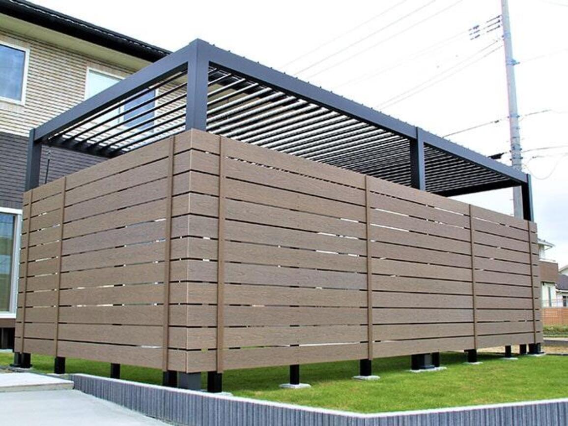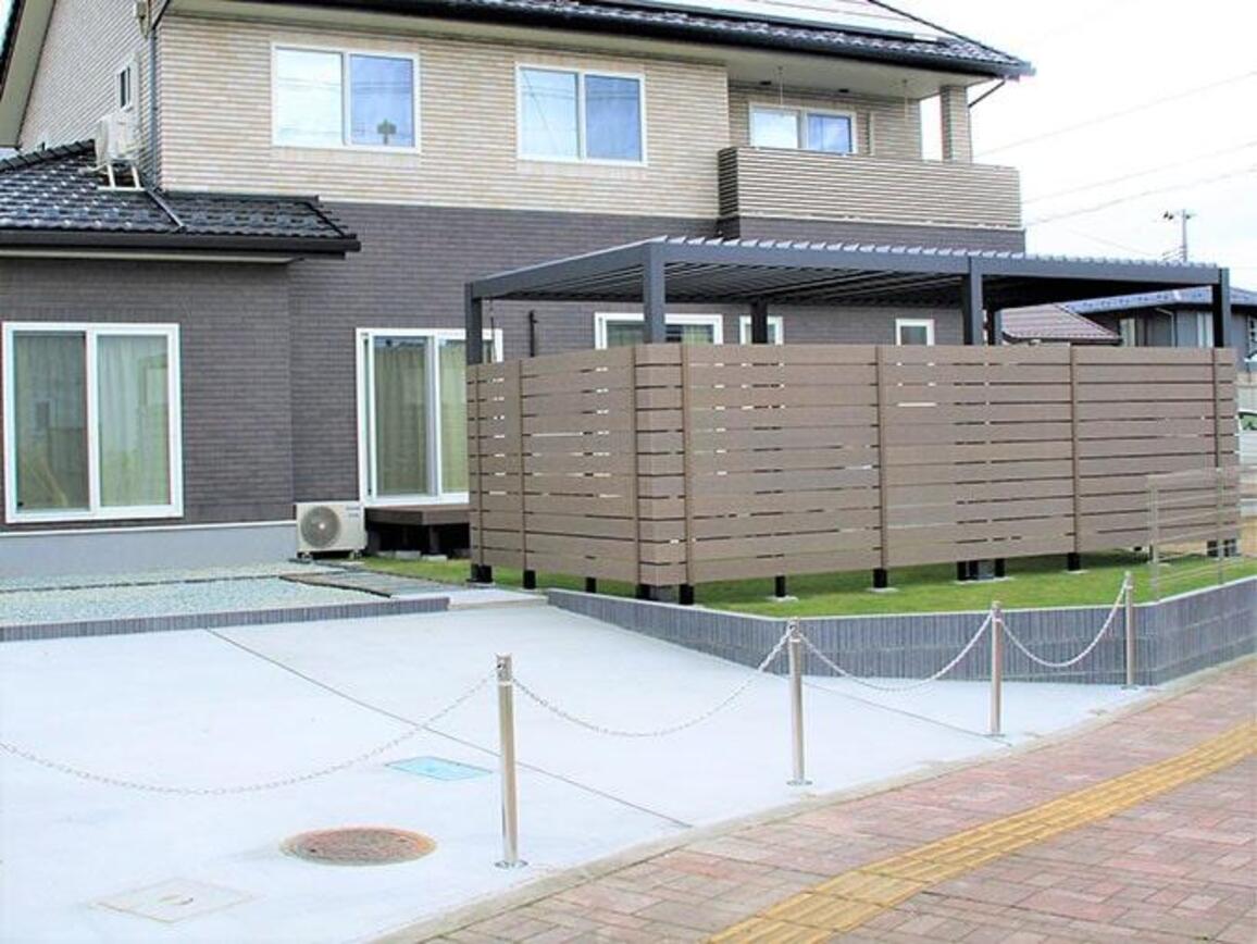開閉式ルーバー屋根のテラス屋根を設置し、熱中症対策はもちろんのこと、お子さんを見守りながら日陰でゆっくりくつろげる空間をご提案しました。屋根周りをぐるっと囲う目隠しフェンスで、しっかりプライベート空間も確保しています。