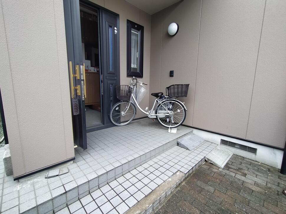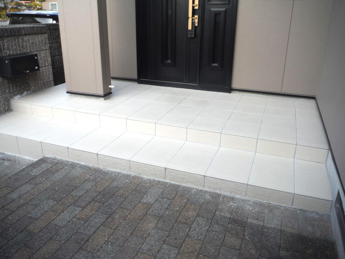 お客様と相談しながら明るい色味のタイルを選択し、夜間でも段差が認識しやすい玄関ポーチに仕上げました。また、300角のタイルを採用することでイマドキな印象に生まれ変わりました。