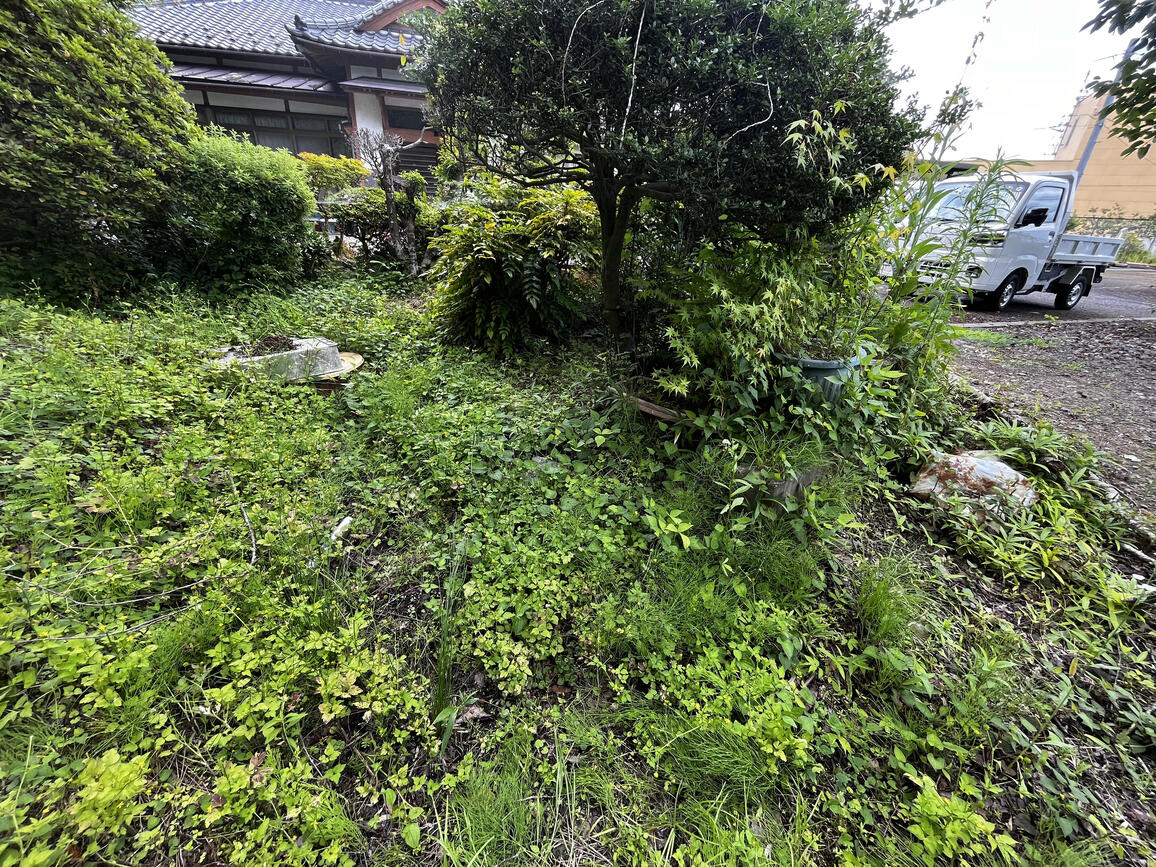 雑草で覆われていた地面を防草シートと砂利敷きでスッキリ歩きやすく整備し、手入れのしやすいお庭に生まれ変わりました。既存の植栽や庭石を活かした提案で、元の雰囲気はそのままに快適な空間に仕上がりました。