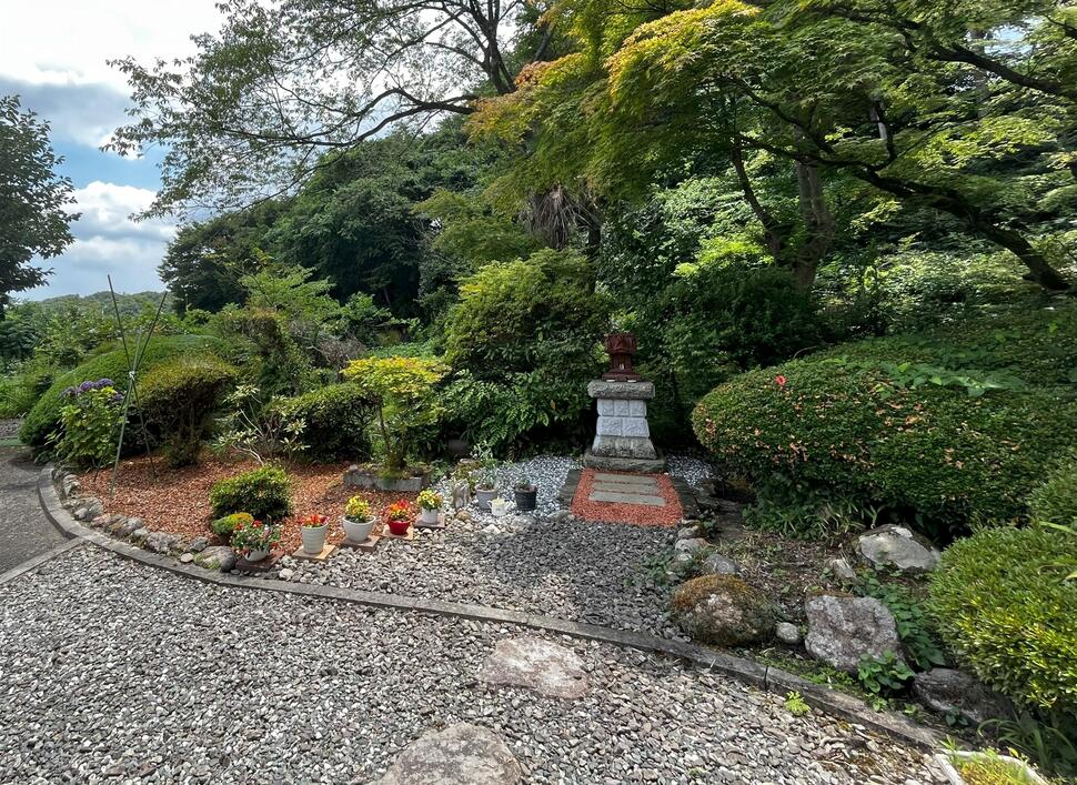 裏山との区切りが曖昧で、お庭の範囲が分かりにくい状況でしたが、既存の側溝に合わせ土留めブロックを設置しました。砂利がこぼれないようにするだけでなく、既存の地形に合わせて段を付けて設置することで雰囲気と調和する仕上がりになりました。