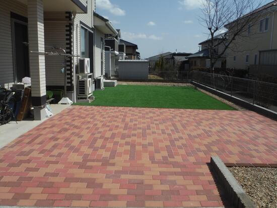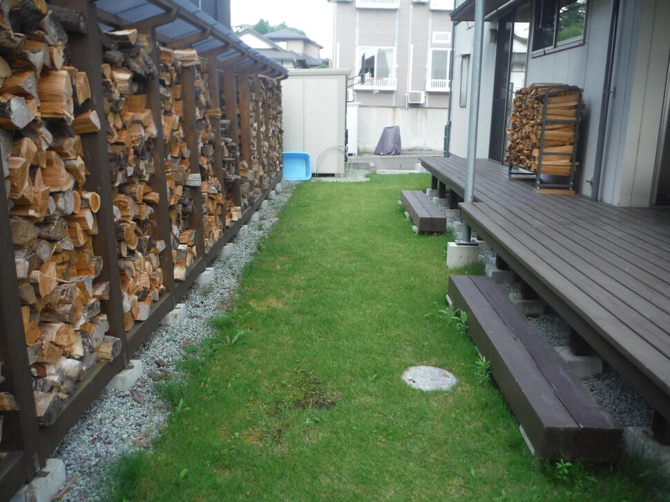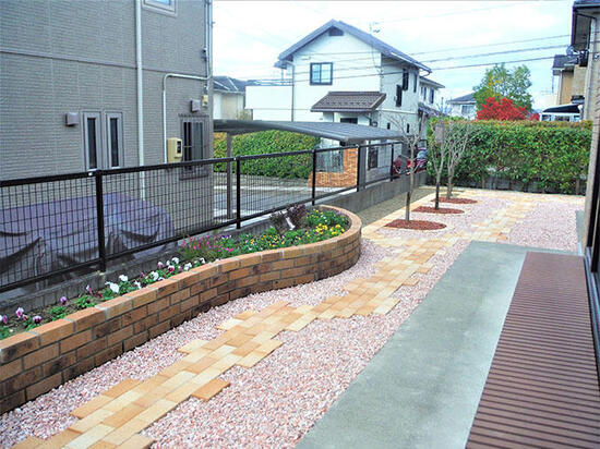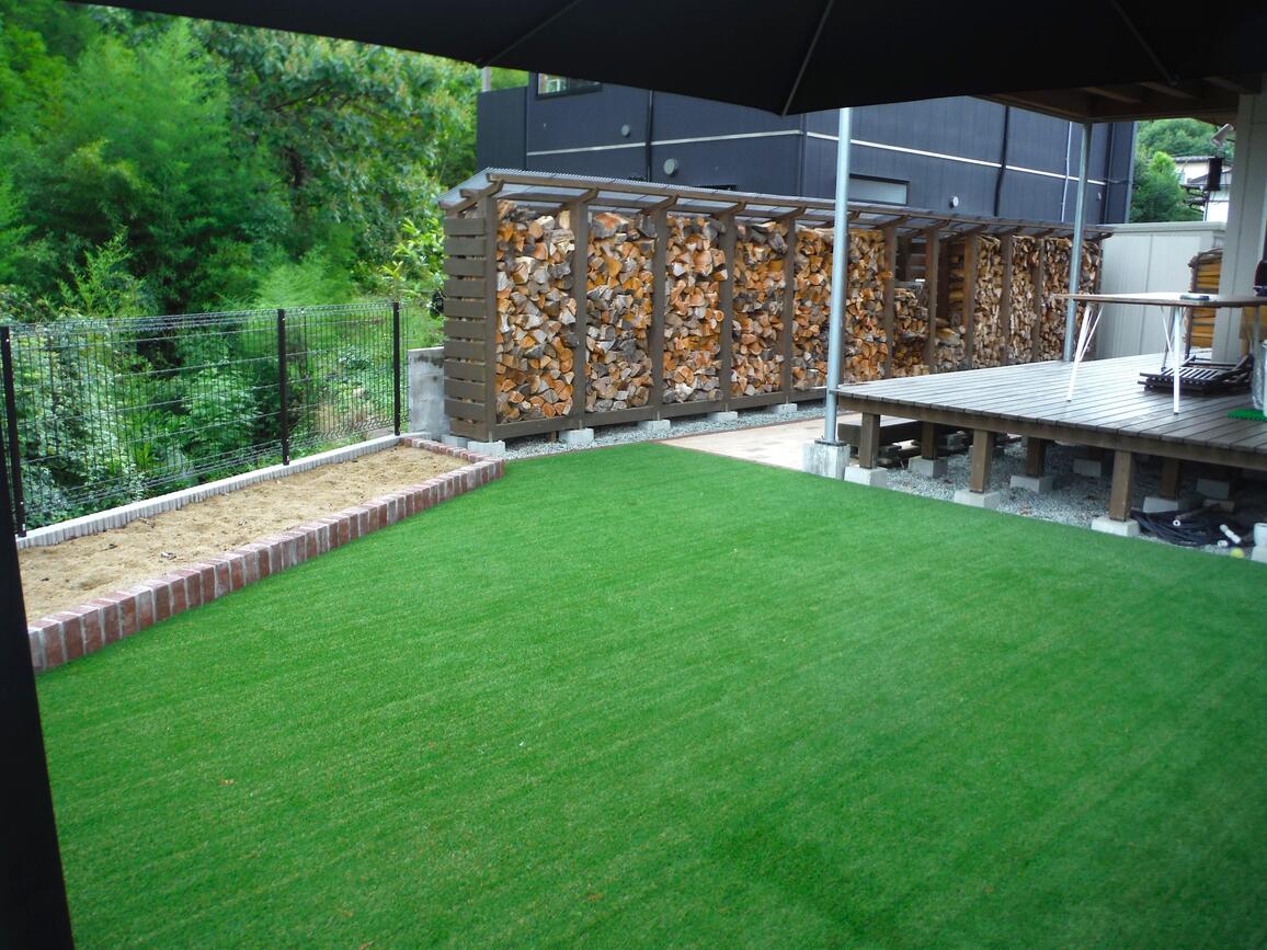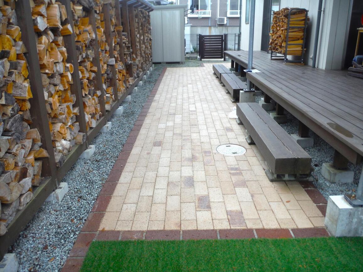 天然素材のレンガは時間が経つと風合いが増し、長く使う外構にはピッタリの商材です。今回は既存の薪棚前への施工をご提案し、薪の木屑の掃除のしやすさも考慮しながら、雑草対策にもなる仕上がりになりました。
