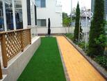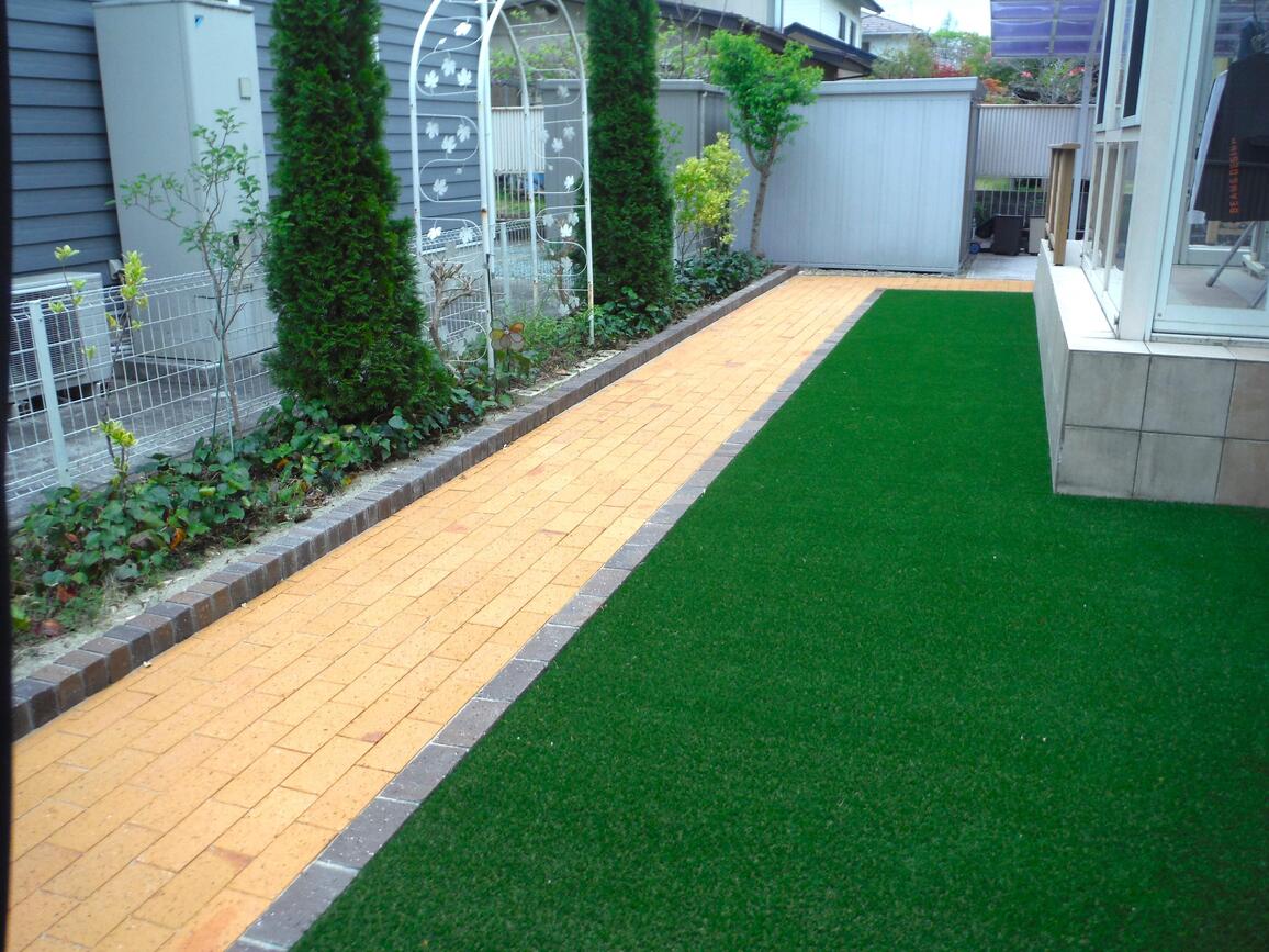 お子様が遊びまわれるお庭が欲しいという夢を叶えるため、人工芝とレンガ敷きのお庭をご提案しました!人工芝では、プールやボール遊び、レンガ敷きでは自転車やラジコンなどいろいろな遊び方が出来ます♪もちろん雑草対策もばっちりです。