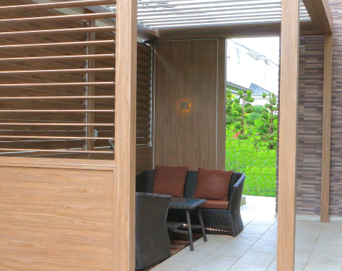 お客様から大好評!天井ルーバーが手動開閉するポーチが低価格で登場。東北でも初めて施工・販売を手掛けた丸山もイチオシ!強い日差しや雨をも凌ぎ、子供たちも走り回れるガーデンライフを生み出します。